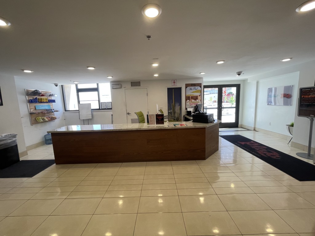 Walk through double glass doors to front desk of pool